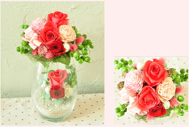 ・プリザーブドフラワーとは生花に特殊加工を施し、花本来の風合い、みずみずしさを損なわずに鑑賞できるように作られたもの